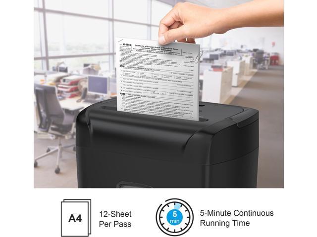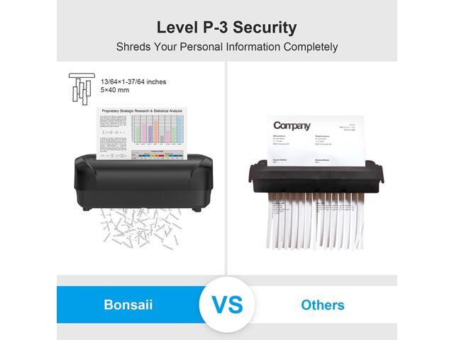 Paper Shredder For Home Use & Small OfficeBonsaii Crosscut paper shredder accepts up to 12 sheets of paper per time and shreds them into small pieces 13/64 * 1-37/64 inches (5x40mm). The heavy duty paper shredder for home office can effectively reduce the problem of paper jam with the high strength alloy cutters. You can also use it to destroy staples, paper clips, credit cards, CDS/DVDs. Overheat and Overload ProtectionThe paper shredder heavy duty for home office continuous shredding at full load for 5 minutes before needing a 40-minute cool-down with overheat/overload LED indicator. 1-YEAR WARRANTYBonsaii paper shredder for home office use provides 1-Year warranty service. If you meet any questions during use, please feel free to contact us, we have professional customer service to help you within 24hrs.