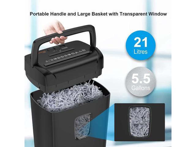 Large Wastebasket & Safe Protection5.5 gallon bin can hold 250 sheets of A4 paper for less frequent emptying. The transparent window makes it easy to see when the bin is full of paper scraps. Comes with a safety switch designed, the home office shredder will stop working and power will be break off once you lift the machines head to ensures your safety.