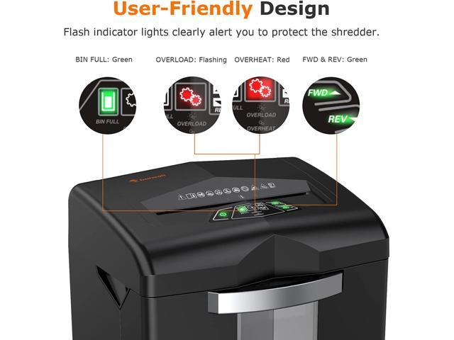 • Smart Indicator LightsThe shredder for office heavy duty equipped with newly upgraded multifunctional indicator lights, smart alert light to remind you empty the bin when the bin full light flashing; overheat light in red remind you to cool down the machine; overload light flashing please use manual reverse functions for paper jam clearing processes. Bringing you a better shredding experience.