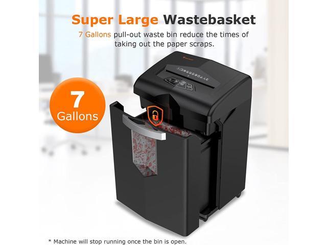• 7 Gallons Large Wastebasket & Safe Protection 7 gallons super large pull out bin with transparent window is easy to remove and empty one handed, much less mess and hassel. Office shredder heavy duty comes with a safety switch designed, it will stop working and power will be break off once you pull out the bin to ensures your safety.Four wheels makes mobility easily.