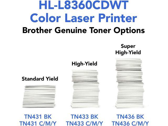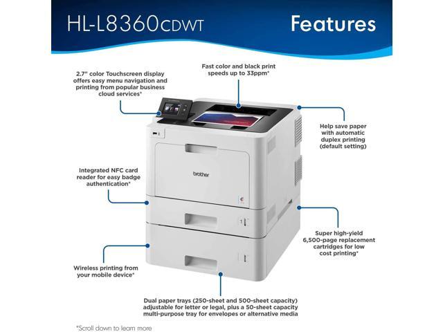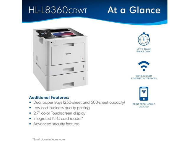 HIGH-QUALITY COLOR PRINTING: The Brother HLL8360CDWT can print high-impact business documents at speeds of up to 33 pages per minute. (1) CPU (Processor) Speed (MHz) : 800LARGE PAPER CAPACITY, EXPANDABLE: Dual paper trays (250-sheet and 500-sheet capacity) that allow busy workgroups to print with fewer interventionsFLEXIBLE CONNECTIVITY: Connect via wireless or Gigabit Ethernet network interfaces or wirelessly print from your mobile device(2). Standard Paper Input Capacity(sheets) – 750. Output Paper Capacity (sheets) – 150 . Multi-purpose Tray Capacity (sheets)- 50. Mobile Device Compatibility – AirPrint, Brother iPrint&Scan, Mopria, Cortado Workplace, Wi-Fi Direct, NFCDASH REPLENISHMENT ENABLED: Upon activation, Dash Replenishment measures the toner level and orders more from when its lowFOR USE WITH BROTHER GENUINE TONERS: TN431: TN431BK, TN431C, TN431Y, TN431M, TN433: TN433BK, TN433C, TN433Y, TN433M, TN436: TN436, TN436BK, TN436C, TN436Y, TN436M