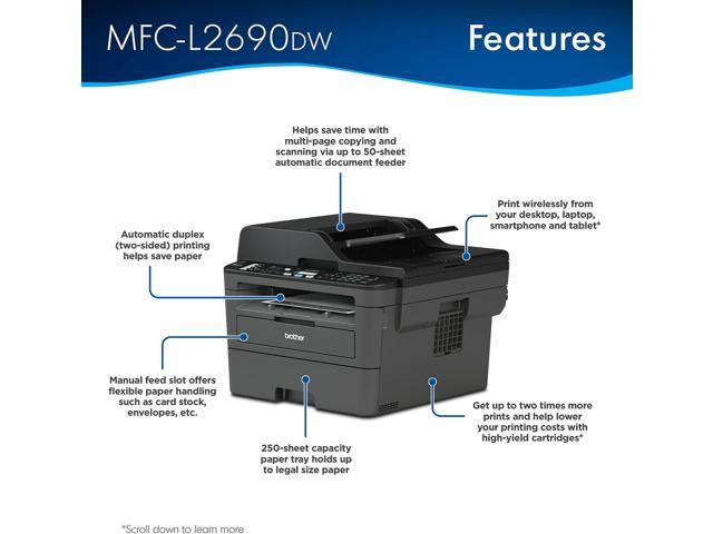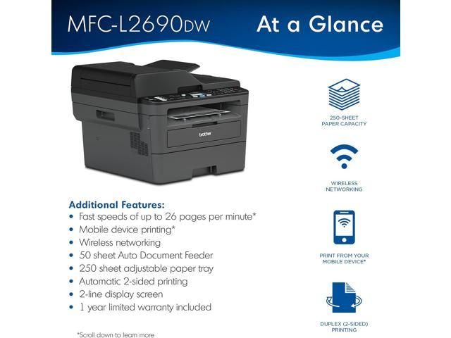 The Brother MFC-L2690DW monochrome all-in-one laser printer delivers full-featured performance for busy home or small offices that need full functionality in a compact, desk-friendly footprint. Its fast print speeds of up to 26 pages per minute + plus automatic duplex (2-sided) printing provide increased efficiency and let you spend less time printing, leaving you more time for running your business. Flexible connectivity options include wireless networking that enables printing from mobile devices, sharing with multiple users on your network or connecting locally to a single computer via USB interface. The 250-sheet capacity adjustable paper tray helps improve efficiency with less refills and handles letter or legal sized paper while the 50-page capacity automatic document feeder enables multi-page copying and scanning