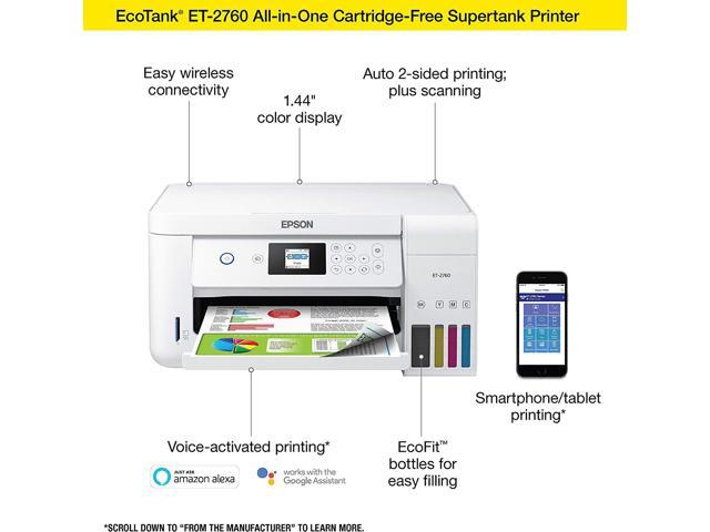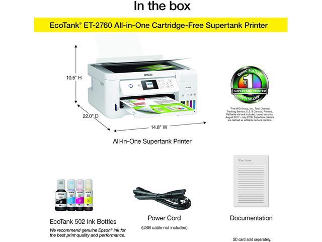 This Epson EcoTank all-in-one inkjet printer has a borderless printing function that lets you print pictures and documents without margins. Turn on borderless printing to turn digital images into stunning full-page photos that are ready to be framed.A built-in memory card slot lets this Epson EcoTank all-in-one printer print and scan to microSD, microSDHC, microSDXC, miniSD, miniSDHC, SD, SDHC, and SDXC cards. Save scanned images to memory cards or use the intuitive control panel to find the files you’d like to print.This Epson EcoTank all-in-one printer has an ink tank system that offers convenient cartridge-free printing. In addition, the included EcoTank 502 ink bottles have EcoFit keyed systems that make it easy to refill the tanks by automatically starting and stopping ink flow to prevent overfilling and spills. The included ink bottles contain the equivalent of 80 standard ink cartridges, enough to print up to 7,500 high-quality pages.