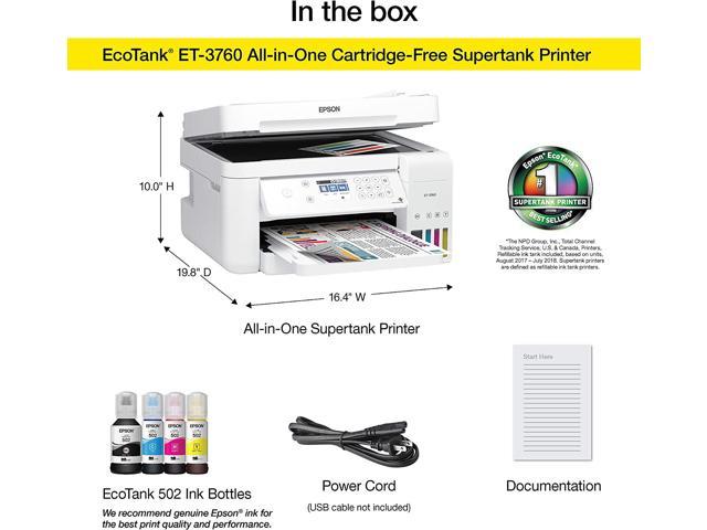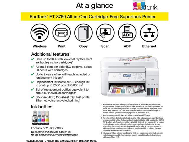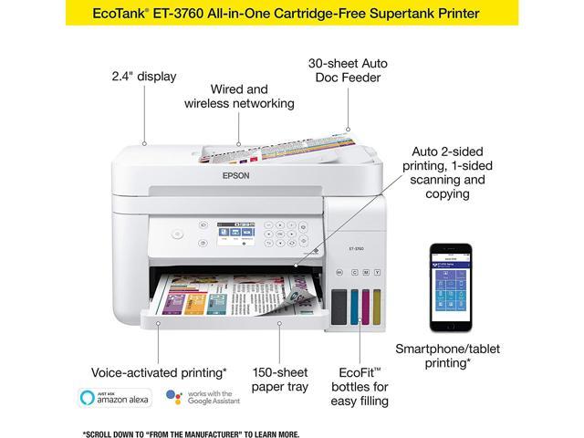 Dramatic Savings on Replacement Ink Save up to 90% with replacement ink bottles vs. ink cartridges1 thats enough to print up to 7,500 pages black/6,000 color , equivalent to about 90 individual ink cartridges Stress-Free Printing Up to 2 years of ink in the box and with every replacement ink set for fewer out of ink frustrationsImpressive Print Quality Unique PrecisionCore Heat-Free Technology and Claria ET pigment black ink produce extremely sharp text plus impressive color photos and graphics on virtually any paper typeRobust Paper Handling Auto Document Feeder, paper-saving auto 2-sided printing and a 250-sheet paper tray for high productivityBuilt-in Scanner and Copier High-resolution flatbed scanner and a 2.4″ color display for easy document copying and navigationModern Connectivity Features Ethernet and wireless, plus hands-free voice-activated printing . Easily print from your smart device with the intuitive Epson Smart Panel App