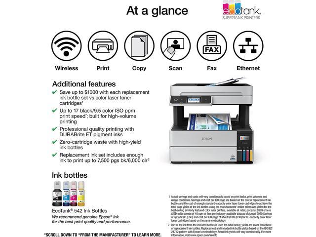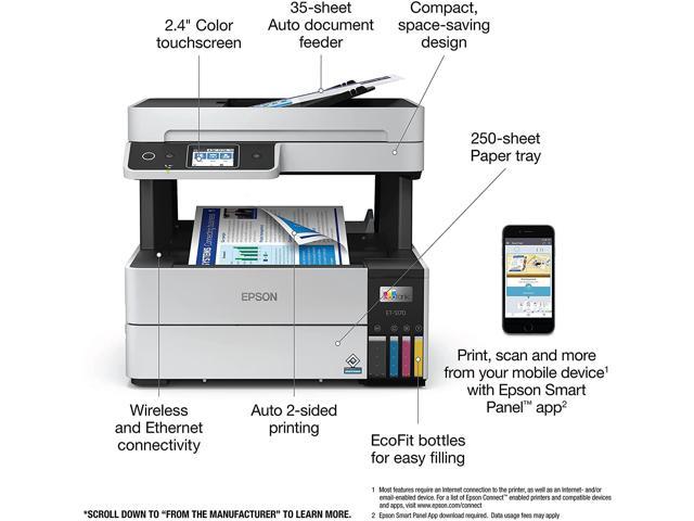 Save a ridiculous amount on ink with revolutionary Cartridge-Free printing save up to 80 percent with low-cost replacement ink bottles vs. standard-capacity color laser toner cartridges thats about 2 cents per color ISO page vs. 14 cents with color laser toner Built for speed up to 17 black/9.5 color ISO ppm print speed (); no warmup time; fast first page outProfessional-quality color prints Epson DURABrite ET pigment inks for crisp, vibrant prints in black-and-white and color.Get more done with powerful productivity features auto 2-sided printing, 250-sheet paper tray, 2.4″ color touchscreen, fax, Ethernet, ADF, face-down outputEasy control from your mobile device the Epson Smart Panel app lets you set up, operate and monitor your printer using your mobile deviceCompact, space-saving design, plus exclusive EcoFit ink bottles uniquely keyed bottles for easy filling of each color; auto start/stop design
