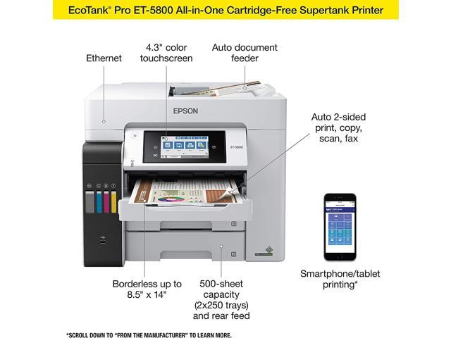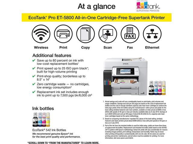 Fast print speed powered by PrecisionCore Heat-Free Technology up to 25 ISO ppm black () no warmup time for fast first page outPrint-shop quality Epson DURABrite Inks are pigment-based for crisp vibrant prints in black-and-white and color that are instant-dry borderless prints up to 8 5″ x 14″Less waste zero-cartridge waste with high-yield ink bottles very low energy consumption Set of replacement bottles includes enough ink to print up to 7 500 pages black/6 000 color for fewer out-of-ink frustrations you could save 1 000 with each one 500-sheet paper capacity two front trays plus a rear feed for specialty paper