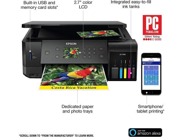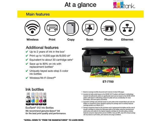 Epson strongly recommends the use of Genuine Epson inks for a quality printing experience; Non Epson inks and inks not formulated for your specific printer may cause damage that is not covered by the Epson warrantyCartridge free printing comes with up to 2 years of ink in the box (1)Includes enough ink to print documents up to 14,000 pages black/9,000 color (3) equivalent to about 30 ink cartridge sets (2)Save up to 80 percent on ink with replacement bottles (4) plus easy to fill, supersized ink tanks5 color inks for printing high quality documents and photos up to 8.5″ x 11″Versatile paper handling dedicated paper and photo trays ; Operating Systems: Windows 10 Windows 8, 8.1 (32 bit, 64 bit) Windows 7 (32 bit, 64 bit) Windows Vista (32 bit, 64 bit) Windows Server 2003 Windows Server 201610 (32 bit, 64 bit) Mac OS X 10.6 macOS 10.12.x11 ; Server Systems: Windows Server 2003 Windows Server 201610 (32 bit, 64 bit).