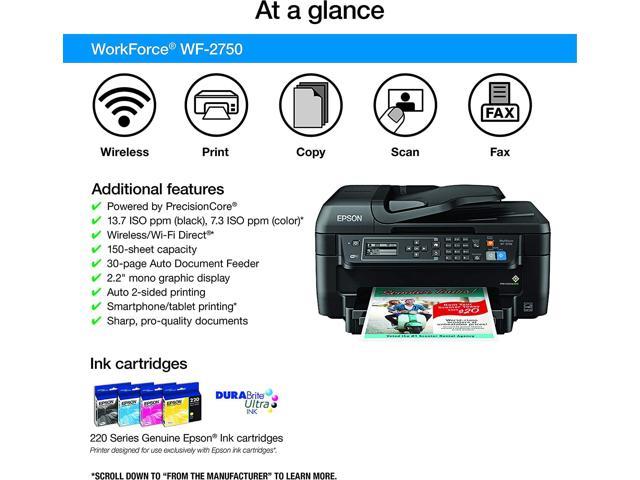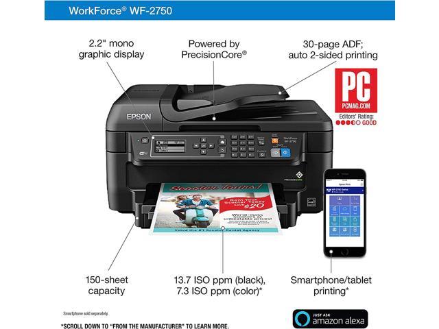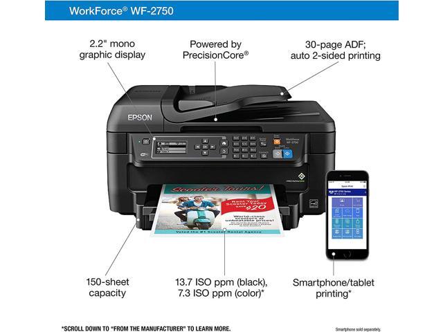 This printer is designed for use with Epson cartridges only, not third party cartridges or ink; Cartridges described as Compatible, Remanufactured, refilled or refillable may not work properly or at all; See product description for more detailsGet laser quality performance The workforce WF 2750, powered by Precision CoreFast printing professional quality prints at speeds of 13. 7 ISO ppm (black) and 7. 3 ISO ppm (color)Reload paper less often 150 sheet paper capacityNever run out of ink again printer features Dash Replenishment which, after activation, keeps track of your ink usage and orders more from when you are running lowNote: This printer is designed for use with Epson cartridges only, not third party cartridges or ink. See product description for more detailsEfficient save time and paper with auto 2 sided printing; Plus, a 30 page auto document feeder for copying and scanningComplete wireless solution easy iPad, iPhone, Android tablet and smartphone printing