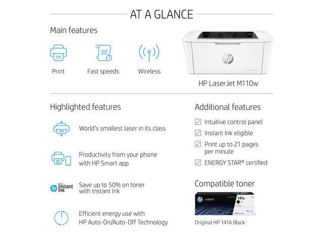 Features HP LaserJet M110w Wireless Black & White Printer with available 2 months Instant Ink