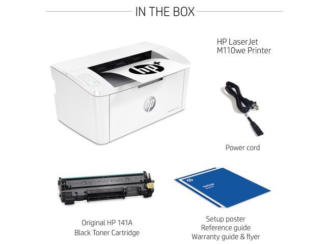 | Package Contents | 7MD66E HP LaserJet M110we Wireless Black & White Printer HP 141A Black LaserJet Toner Cartridge Power Cord Setup Poster Reference Guide Warranty Guide & Flyer |