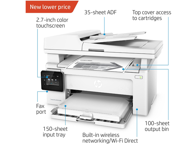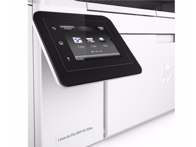 Keep things simple with a compact HP LaserJet Pro powered by JetIntelligence Toner cartridges. Print professional documents from a range of mobile devices, plus scan, copy, fax, and help save energy with a wireless MFP designed for efficiency. Desktop Mono Laser All-in-One printer Resolution up to 600 x 600 dpi Print up to 23 ppm black with a monthly duty cycle up to 10, 000 pages Standard (Wi-Fi 802.11 b/g/n); Hi-Speed USB 2.0 port (device); built-in Fast Ethernet 10/100Base-TX network port; Phone line port; Apple AirPrint; HP ePrint; Google Cloud Print 2.0 150-Sheet input tray 600 MHz processor with 256 MB onboard memory; fax memory up to 1000 pages Energy Star; MOPRIA certified 35 sheet ADF; HP Auto-On/Auto-Off Technology; Print directly from mobile device with wi-fi direct 2.7 in touch screen LCD display (color graphics) Password-protected network embedded Web server; enable/disable Network ports; SNMPv1 community password change Dimensions 16.66″W x 11.34″D x 11″H What’s in the box HP LaserJet Pro MFP M130fw HP Black LaserJet Toner Cartridge ~700 pages HP LaserJet Imaging Drum ~12, 000 pages Power cord Phone cord USB cable Getting started guide Set up poster Support flyer Printer documentation and software on CD-ROM Errata, declaration ( some countries )