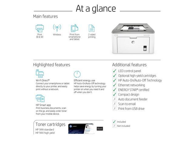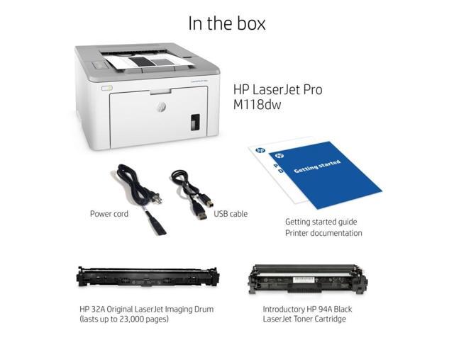Print sharp text and crisp images fast with the HP LaserJet Pro M118dw wireless laser printer with mobile printing and fast print speed – up to 30 pages per minute black. This monochrome laser printer is designed to save resources and energy as HP’s best-value printer for automatic 2-sided printing. Download the HP Smart app and print from Dropbox or Google Drive right on your smartphone. No matter how you choose to connect to your wireless laser printer, you can be confident in quality prints. 1,000 PROFESSIONAL-QUALITY PAGES. Produce 1,000 pages of crisp, sharp text and smooth grayscales right out of the box with this wireless LaserJet pro printer. PRINT FROM VIRTUALLY ANYWHERE. The 4.5-star rated HP Smart app allows you to scan from your smartphone or tablet, order toner, and print from iCloud, Google Drive, Dropbox, and more. MOBILE PRINTING, EVEN WITHOUT A NETWORK Use Wi-Fi Direct to connect your smartphone directly to your printer without accessing your local network for fast, convenient productivity. WAIT LESS, PRINT MORE. Speed through print jobs with up to 30 pages per minute black. Recommended monthly volume of 200-2,000 pages. HIGH-QUALITY PRINTS, EVERY TIME. This duplex printer is designed to deliver crisp text and clean images the first and every time, so you can stay productive with uninterrupted printing. COMPACT DESIGN. Minimum dimensions: 14.6″W x 16″D x 8.8″H. WIDE RANGE OF PAPER SIZE SUPPORT Letter, legal, executive, 8.5 x 13, envelope. ORIGINAL HP TONER. HP LaserJet Pro M118dw uses Original HP 94A/94X black toner cartridges. WHAT’S IN THE BOX: 4PA39A HP LaserJet Pro M118dw. HP LaserJet Black introductory toner cartridge (~1,000 pages). HP Original LaserJet Imaging Drum (~23,000 pages). power cord. USB cable. Getting Started Guide. printer documentation. ONE-YEAR LIMITED HARDWARE WARRANTY. 24-hour, 7 days a week Web support.