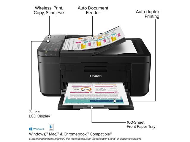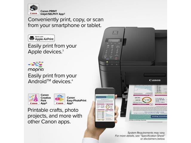 SIMPLE INITIAL SETUP through the Canon PRINT Inkjet/SELPHY app2 EASY CARTRIDGE INSTALLATION & replacementEasy to load FRONT PAPER TRAY 100 sheet plain paper capacityAUTO DOCUMENT FEEDER, efficiently scans multi-page documents up to legal sizeSave up to 50% of your paper costs with AUTO 2-SIDED (DUPLEX) PRINTING for letter size documentsA HYBRID INK SYSTEM produces both sharp black text and colorful printsWith BUILT-IN WIRELESS1 connectivity, easily print from any room from laptops, tablets, and smartphonesENHANCED CREATIVITY with mobile and PC applications: Easy-PhotoPrint Editor5, Creative Park App6, and Poster Artist Lite (Windows only)7SMART ASSISTANT SUPPORT: Google HomeTM smart devices8PRINT SPEEDS: approximately 8.8 images per minute (black) / 4.4 images per minute (color)10AUTO POWER ON/OFF: automatically turns on when you need it and off when you dontDOCUMENT REMOVAL REMINDER: lets you know when youve left an original document on the scanner
