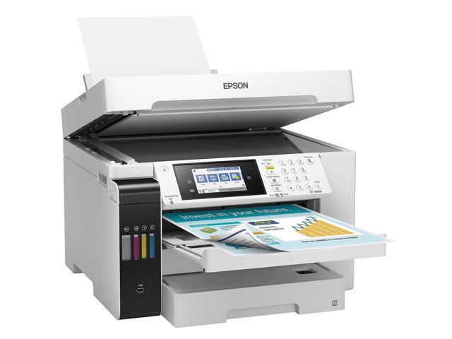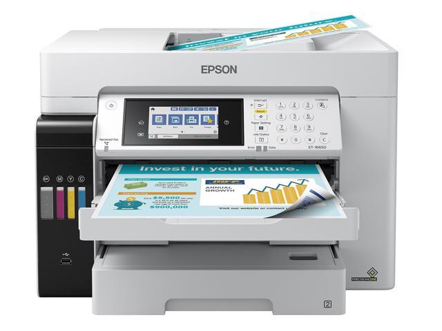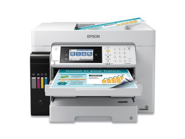 The wide-format EcoTank Pro ET-16650 wireless all-in-one offers fast cartridge-free printing with easy-to-fill supersized ink tanks. You can save up to 80 percent with low-cost replacement ink bottles vs. standard-capacity color laser toner cartridges—about 2 cents per color ISO page versus 14 cents with cartridges. PrecisionCore Heat-Free Technology delivers high-volume, print-shop-quality output. This all-in-one with Epson DURABrite pigment-based ink delivers vibrant prints up to 13″ x 19″ and scans up to 11″ x 17″. Borderless prints up to 11″ x 17″. Each replacement ink set included enough ink to print up to 6,000 pages. Plus, theres zero cartridge waste and very low energy consumption. The ET-16650 features a 500-sheet front tray paper capacity and rear specialty-paper feed, plus a 4.3″ color touchscreen and hands-free voice-activated printing. Maximum Print Speed (Black): 25 ppm; Maximum Print Speed (Color): 25 ppm; Print Resolution (Black) (Width x Height): 4800 x 2400 dpi; Print Resolution (Color) (Width x Height): 4800 x 2400 dpi.