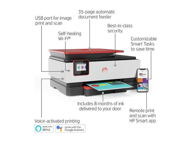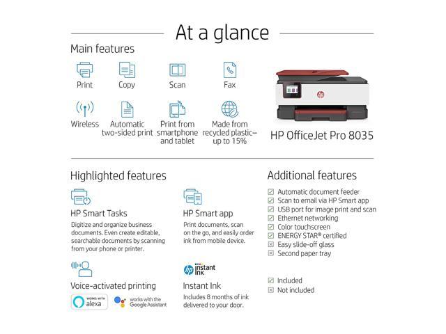 Set the new standard in business productivity. The HP Office Jet Pro 8035 All-in-One is a revolutionary home office printer that offers fast print speed and easy-to-use copy, scan and fax function in a stylish package. Features like Smart Tasks and scan-to-USB capabilities help increase productivity and save time. Thanks to the 8035’s self-healing Wi-Fi and best-in-class security, it can reduce interruptions and maintain privacy and control. No matter how you choose to connect to your wireless printer, you can be confident in quality prints.