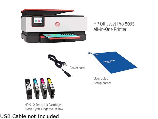 | Package Contents | OfficeJet Pro 8035 All-in-One Printer 910 Setup Black Instant Ink Ready Cartridge 910 Setup Cyan Instant Ink Ready Cartridge 910 Setup Magenta Instant Ink Ready Cartridge 910 Setup Yellow Instant Ink Ready Cartridge Ink Caution Flyer Power Cord Setup Poster Reference Guide Instant Ink Flyer |