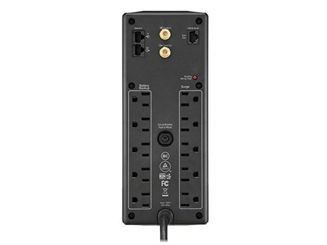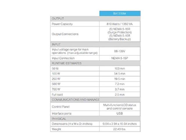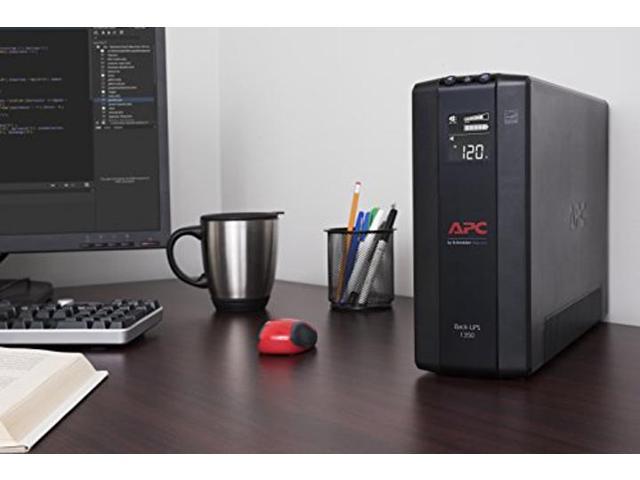 1350VA / 810W battery backup power supply 10 Outlets (NEMA 5-15R): 5 surge protector with battery backup; 5 outlets with Surge Protection Only Boost Automatic Voltage Regulation (AVR): instantly corrects low/high voltage fluctuations without discharging the battery, and is Active PFC compatible Replaceable Battery: Easily replace the battery back up with a genuine APC replacement battery, model APCRBC123 (sold separately) 1 GB network dataline protection, 6′ Power Cord, right-angle 3-prong wall plug (NEMA 5-15P), and free Windows PC power-management software (Mac OS uses native “Energy Saver” Settings)