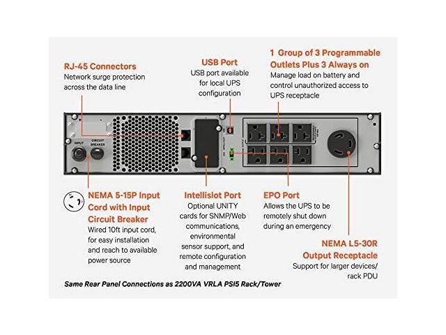 ADVANCED PURE SINE WAVE UPS: 800VA/720W line interactive system compensates for power fluctuations, protects against equipment damage, and prevents data loss in the event of a power disturbance6 SURGE/BATTERY BACKUP OUTLETS: 6 battery backup/surge protection outlets, 2-year warranty, compact 2U rack mount/tower convertible configuration, and controllable outlet groups1 GROUP OF PROGRAMMABLE OUTLETS: Provides ability to cycle power remotely for connected equipment and turn off non-critical equipment to extend battery run time of critical loadAVR LINE INTERACTIVE: buck/boost Automatic Voltage Regulation (AVR) technology protects against utility power fluctuation without battery operation, prolonging battery lifeROTATABLE LCD DISPLAY: Allows users to view real-time conditions, alarm notices, and runtime information; All Liebert UNITY network communications cards come integrated within the unit
