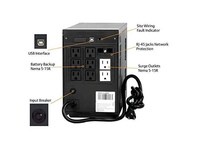 STEPPED SINE WAVE UPS: 800VA/480W with 16 minutes of battery back-up time at half loadOUTLETS: 6 battery backup outlets / 2 surge outlets / USB portLINE-INTERACTIVE: AVR technology (automatic voltage Regulation) ensures consistent and clean powerWARRANTY: Completely hassle-free, no questions asked, two-year warrantyRJ45 PROTECTION: Site wiring fault indicator and EMI/RFI filters