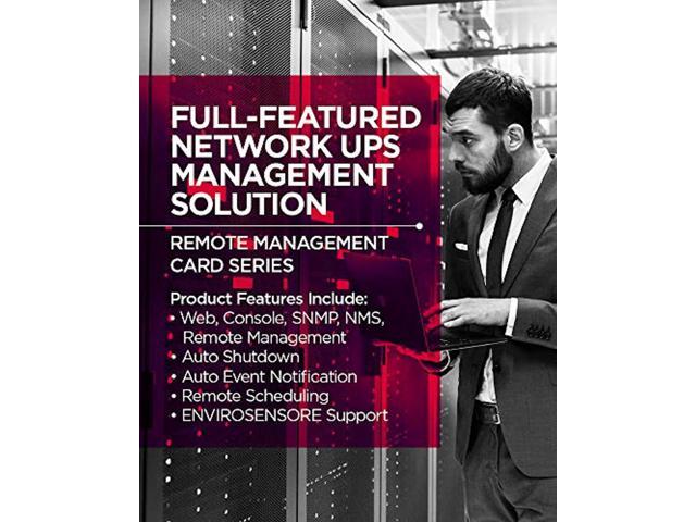 Remote management and configuration of UPS and ATS PDUs (HTTP/HTTPS) via Web Browser or NMS (SNMPv1/v3) Real time UPS monitoring / Supports optional environment sensor (ENVIROSENSOR) Automatic events notification via Email, SMS, SNMP Traps, and Syslog Supports RADIUS, LDAP, LDAPS, and Windows Active Directory external authentication protocols Hot swappable. 10/100 Mbps Ethernet port. Quick installation and user friendly interface