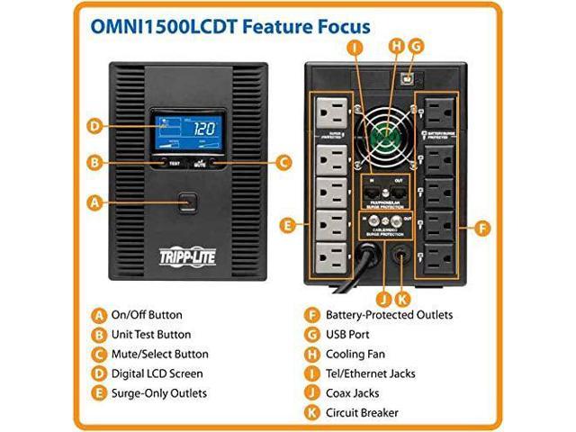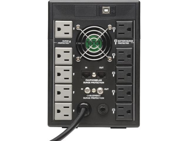 The SMART1500LCDT SmartPro LCD 120V, 1500VA/900W Line-Interactive Uninterruptible Power Supply provides battery backup and AC power protection against blackouts, brownouts, power surges and line noise that can damage electronics or destroy data. Ideal for backing up your desktop computer or audio/visual components, this line-interactive UPS switches to battery backup mode in milliseconds to keep your connected equipment running long enough to save files and shut down safely with no data loss. While all ten NEMA 5-15R outlets protect against surges, five outlets also provide up to 90 minutes of UPS battery support for a basic desktop PC and LCD monitor and up to 10 minutes of support at half load (450W). Automatic voltage regulation (AVR) corrects under voltages as low as 92V and overvoltages as high as 150V without using any battery power. EMI/RFI noise filtering improves your equipments performance and prevents damage. A 650-joule surge suppression rating protects your equipment from harmful power surges. NEMA 5-15P plug with 6-foot cord connects to any NEMA 5-15R socket. Large LCD screen shows real-time input voltage, overload, AVR, remaining battery runtime and battery statuses at a glance. Alarm sounds to indicate power loss or low battery. With Tripp Lites PowerAlert software (available via free download), SMART1500LCDT enables safe unattended system shutdown and file saves in case of a prolonged power failure.